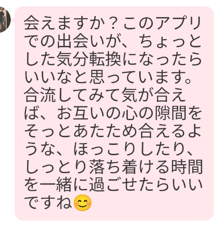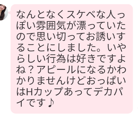 にもかかわらず、いきなりはじめましてのメッセージで「会いたい」など、もっと攻めたお誘いのメッセージを送る人もいて、出会おうとしてくる女性ばかりでした。
