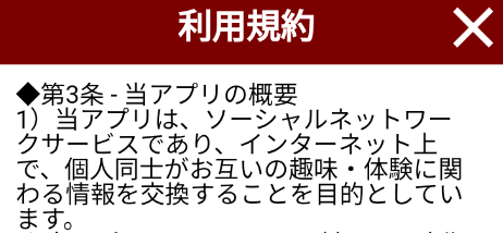 実際、規約には異性紹介事業として書かれてはおらず、「当アプリはソーシャルネットワークサービスであり、インターネット上で、個人同士がお互いの趣味・体験に関わる情報を交換することを目的としています。」と書かれていました。