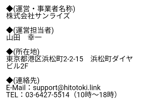| 連絡先 | E-Mail:support@hitotoki.link TEL:03-6427-5514 |