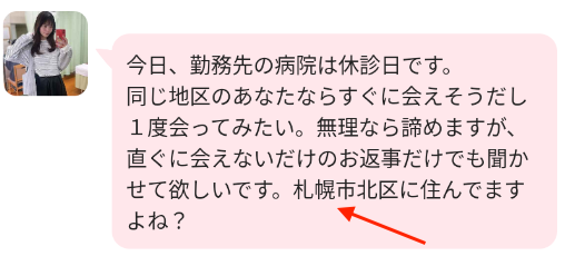 「地域」や「年齢」など、こちらの登録情報からわかる部分だけがすり替わった、他はテンプレートの文章をどんなユーザーにも送っているようです。
