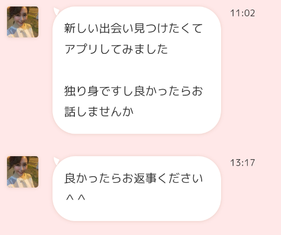 アプリをインストールするとさっそく女性の方からメッセージが来るのですが、メジャーではないアプリを使ってサクラ以外からメッセージが届くというのは、ほとんどありえない現象かなと思います。
